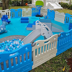 12x12 ft with 2 inch thick Mat Fence 2 Rocking Horses 2 Hoppers 7 Soft play blocks Ball pit Slide 2 Piece climber 4 Piece climber Basketball hoop Bounce House can be added at additional cost May be subject to a delivery fee